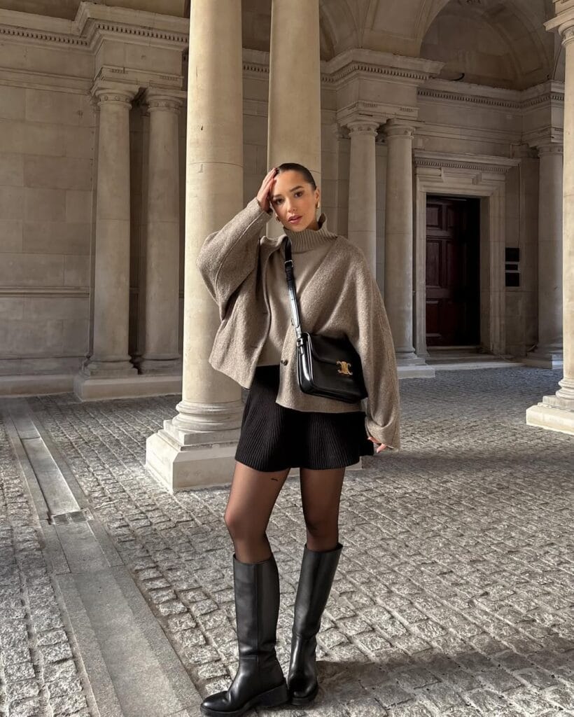 @ fleurraffanChanneling effortless cool, sheās bundled up in a roomy taupe knit sweater above a fitted black mini skirtāwith sheer tights and long black boots for a bold fall silhouette. This look captures that perfect city vibe: relaxed but totally on-trend.