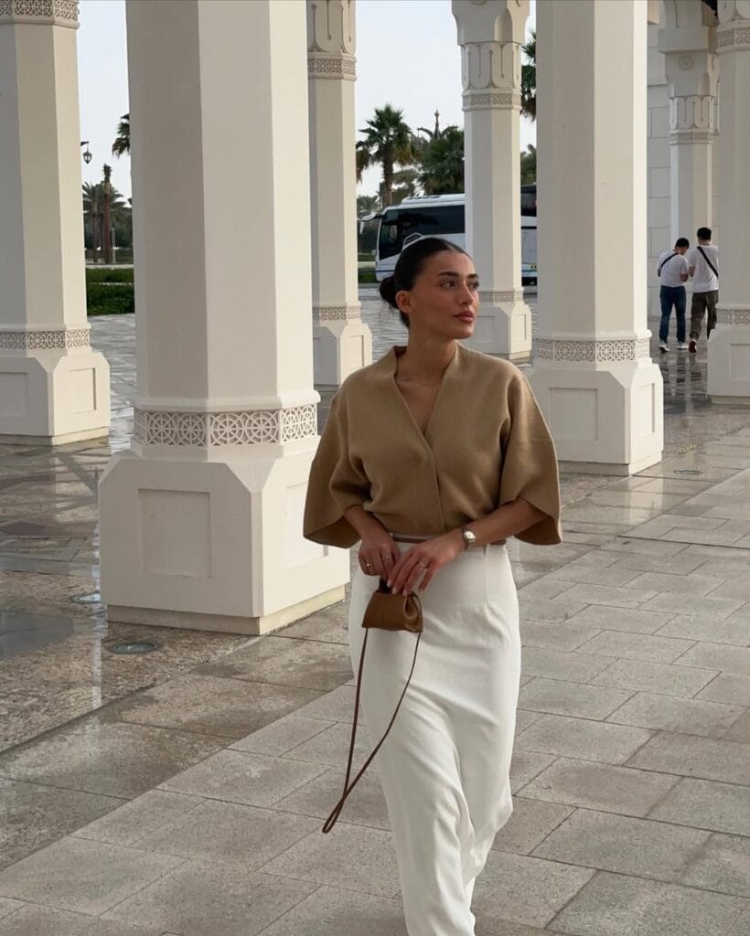 @ sherienboniSheās serving up elegant fall vibes in a soft camel wrap knit paired with a crisp white maxi skirtāthe perfect balance of cozy and sophisticated layering. The relaxed sleeves keep things laid-back but polished for strolling under grand arches.
