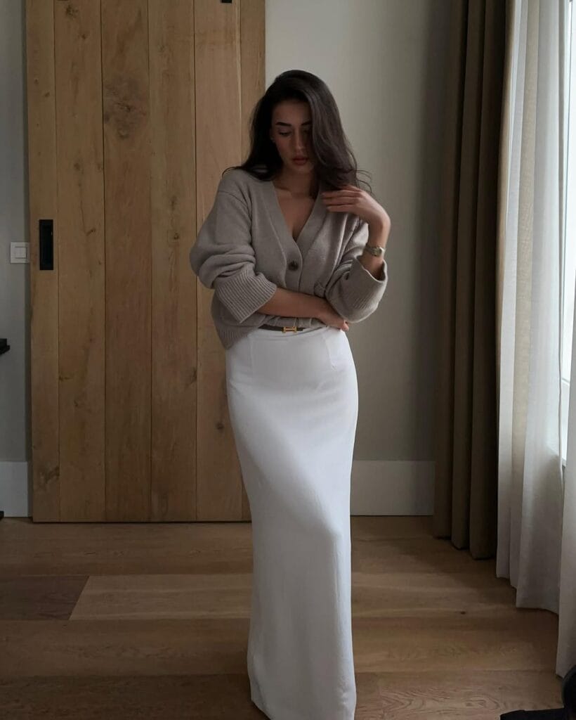 4. Soft Taupe Cardigan & Sleek White Skirt Combo