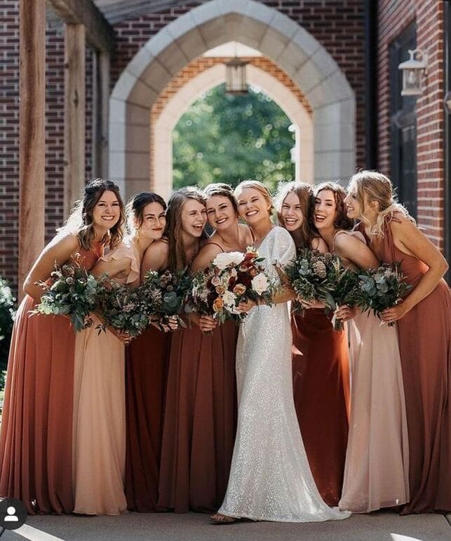 This stunning rust maxi dress is perfect for a fall wedding, blending seamlessly with the autumnal hues.