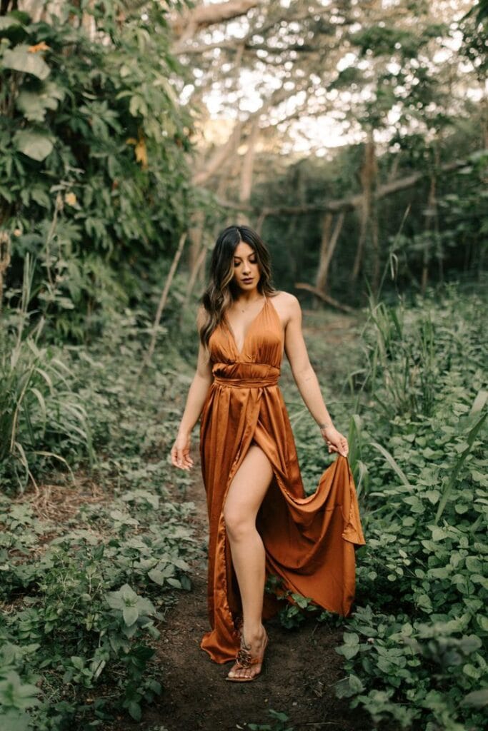 The rich, warm color and flowing fabric create an elegant and ethereal look, ensuring you stand out in style.