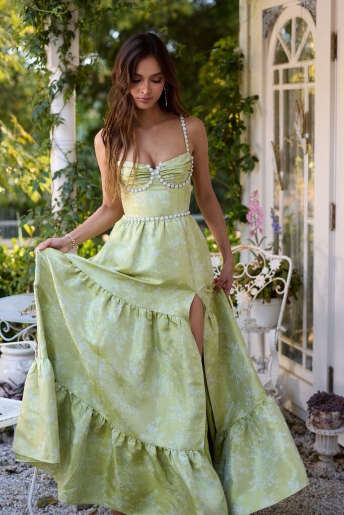 29. Emerald Green Satin Floral Jacquard Maxi Dress: Luxurious and Lush for Autumn