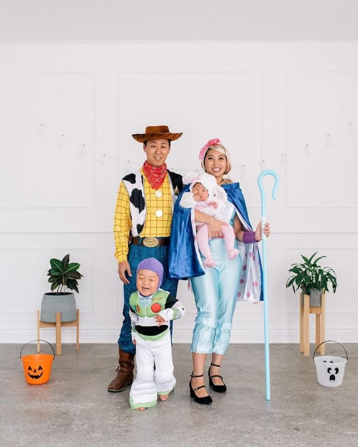 Head to infinity and beyond this Halloween as Woody, Bo Peep, Buzz Lightyear, and a tiny Little Bo Peep, all in adorable matching Toy Story costumes! Every detail is filled with color and character, making this family look the star of every fun, photo-ready moment.