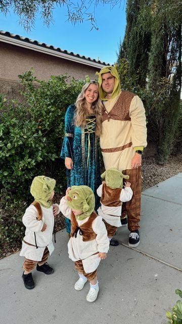 Step right out of the swamp with a Shrek family groupāShrek, Fiona, and a trio of adorable baby Shreks, full of fairy-tale fun! These perfectly coordinated costumes bring storybook magic and an overload of cuteness to every photo-ready moment.