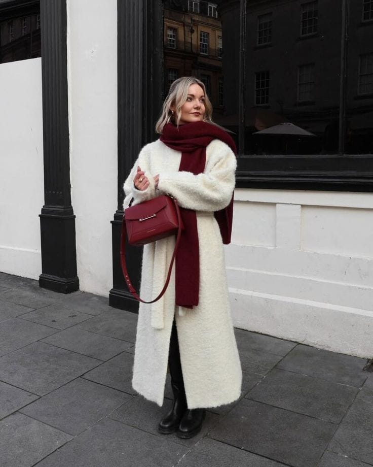 She’s bundled up in a long cream teddy coat with a rich burgundy scarf wrapped snugly around her neck for that cozy, city‑stroll moment. Black boots and a structured red crossbody bag finish the look and add the perfect pop of contrast against the soft outerwear.