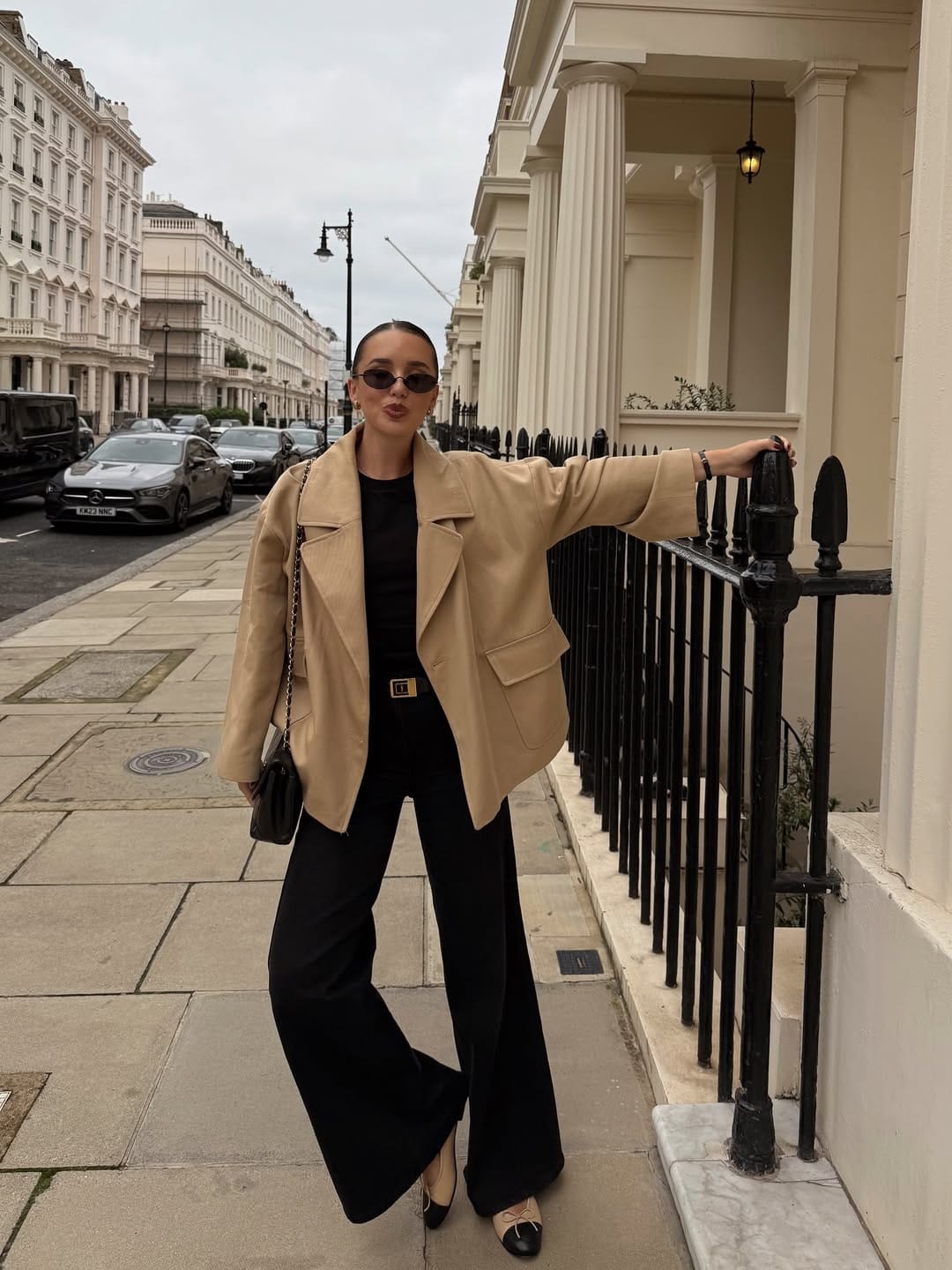 She’s serving minimalist city vibes in a roomy camel jacket thrown over a simple black top and ultra‑wide black trousers. A sleek black belt, cap‑toe flats, and a chain‑strap bag pull everything together into the perfect everyday “running around the city but still chic” outfit.