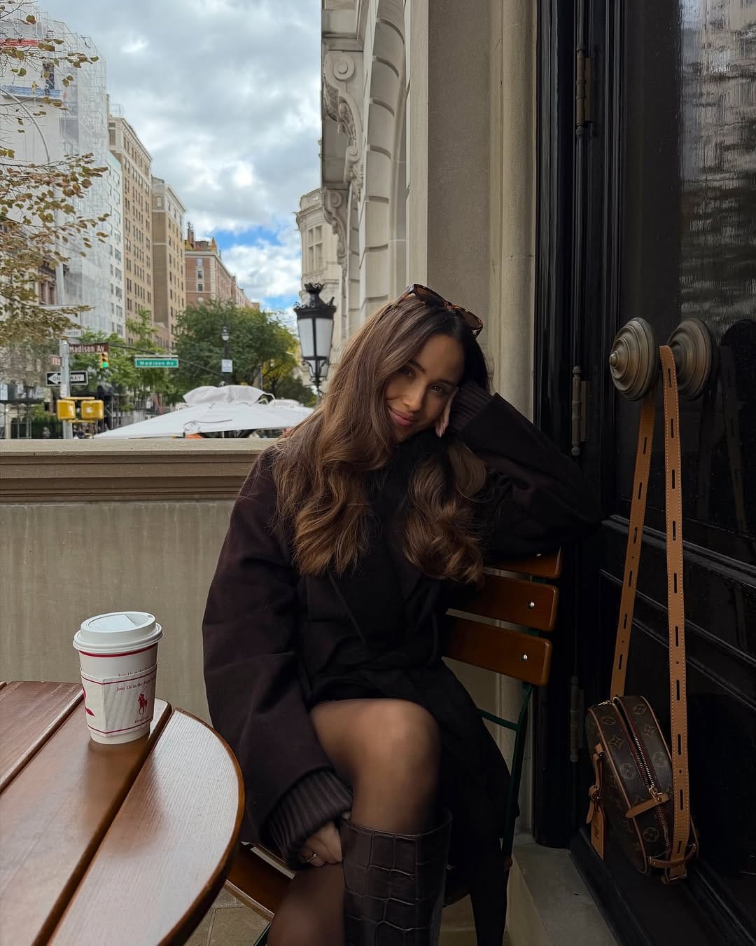 She’s going moody and chic in a deep brown wool coat layered over a short dress and sheer black tights, perfect for a cool‑weather coffee date. Croc‑embossed knee‑high boots, a crossbody bag hanging on the wall, and oversized sunglasses complete this quietly luxe moment.