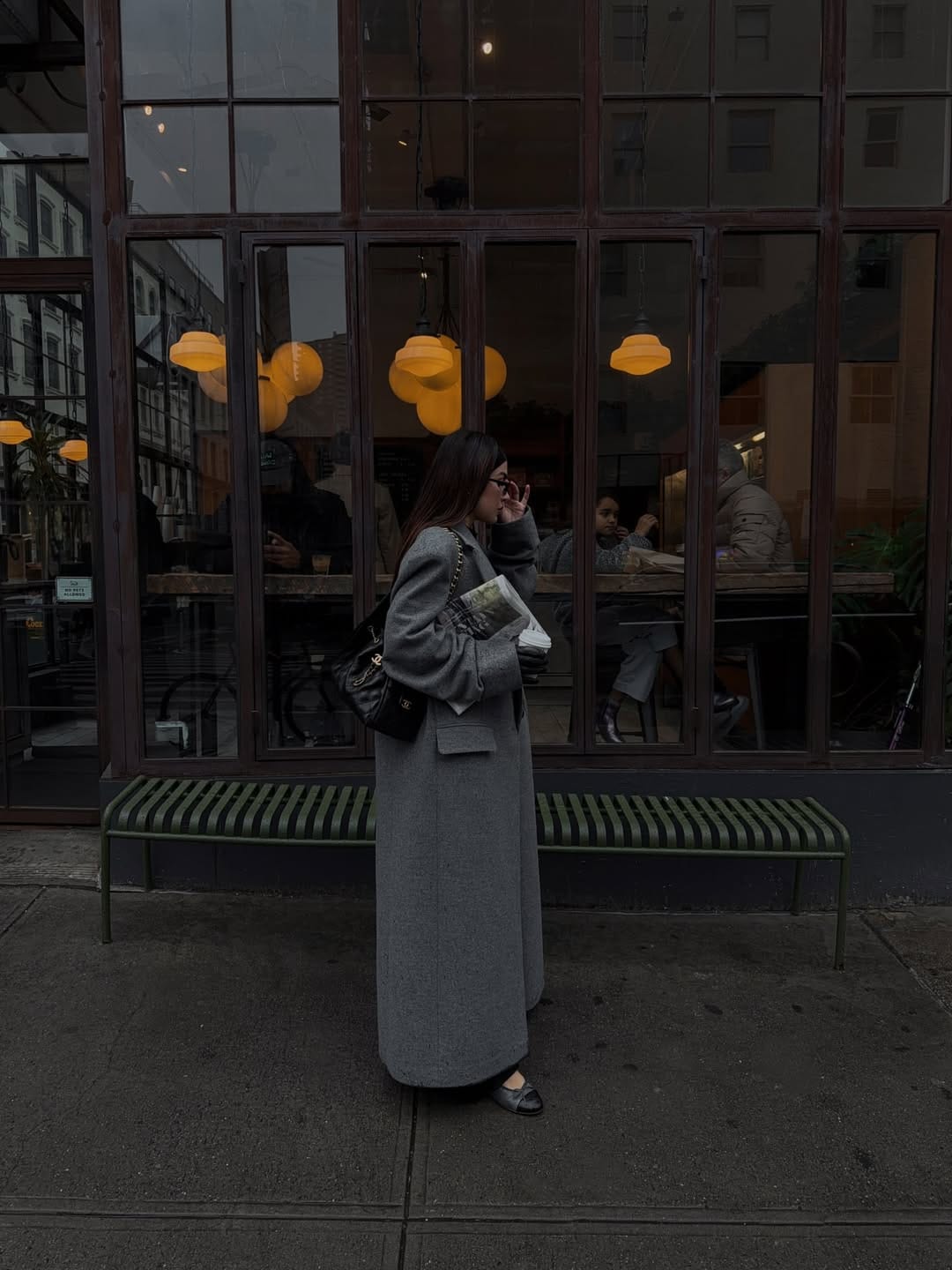 She’s keeping things effortlessly cool in a long grey maxi coat layered over an all‑black outfit, giving major “running out for coffee but still chic” energy. A black quilted shoulder bag and simple black flats keep the look minimal, polished, and perfect for a rainy city day.