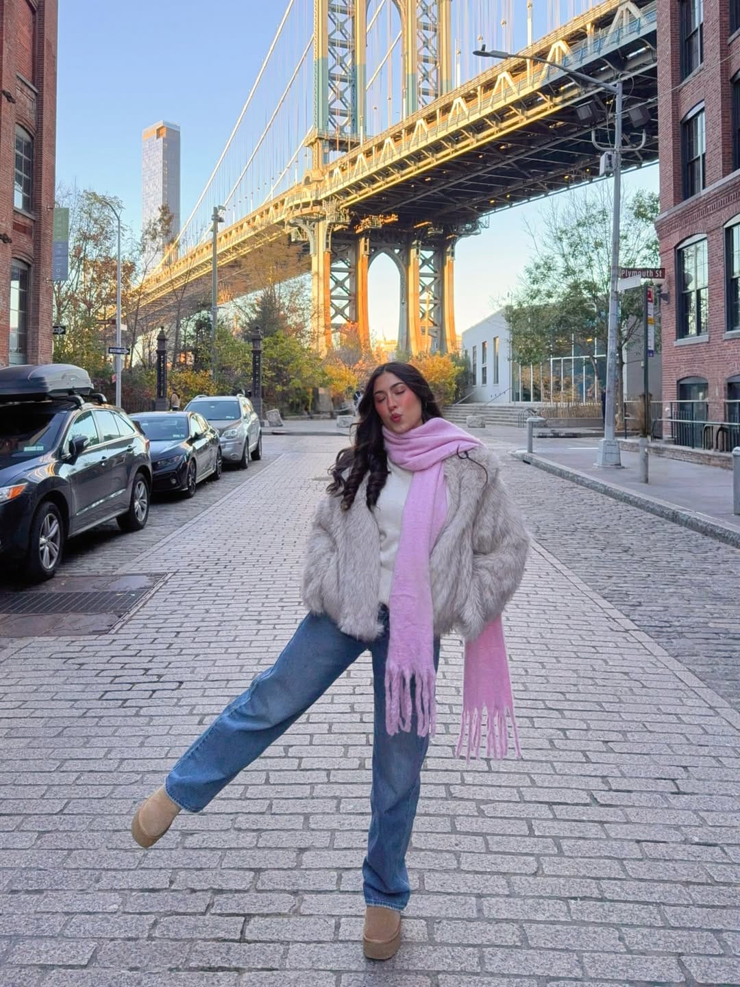 She’s brightening up the bridge views in a cozy grey faux‑fur jacket over a light knit, paired with straight‑leg blue jeans for that laid‑back winter vibe. A pastel pink scarf, chunky tan platform boots, and loose waves make the outfit feel playful and super comfy for exploring the city.