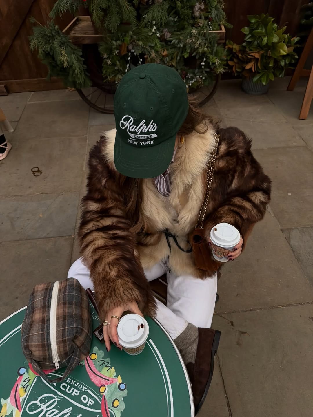 She’s mixing cozy and cool in a rich brown faux‑fur coat layered over a striped shirt, paired with straight white jeans for that effortless coffee‑run vibe. A dark green baseball cap, chunky boots, and a chain‑strap bag make the whole look feel sporty, slouchy, and so fun.