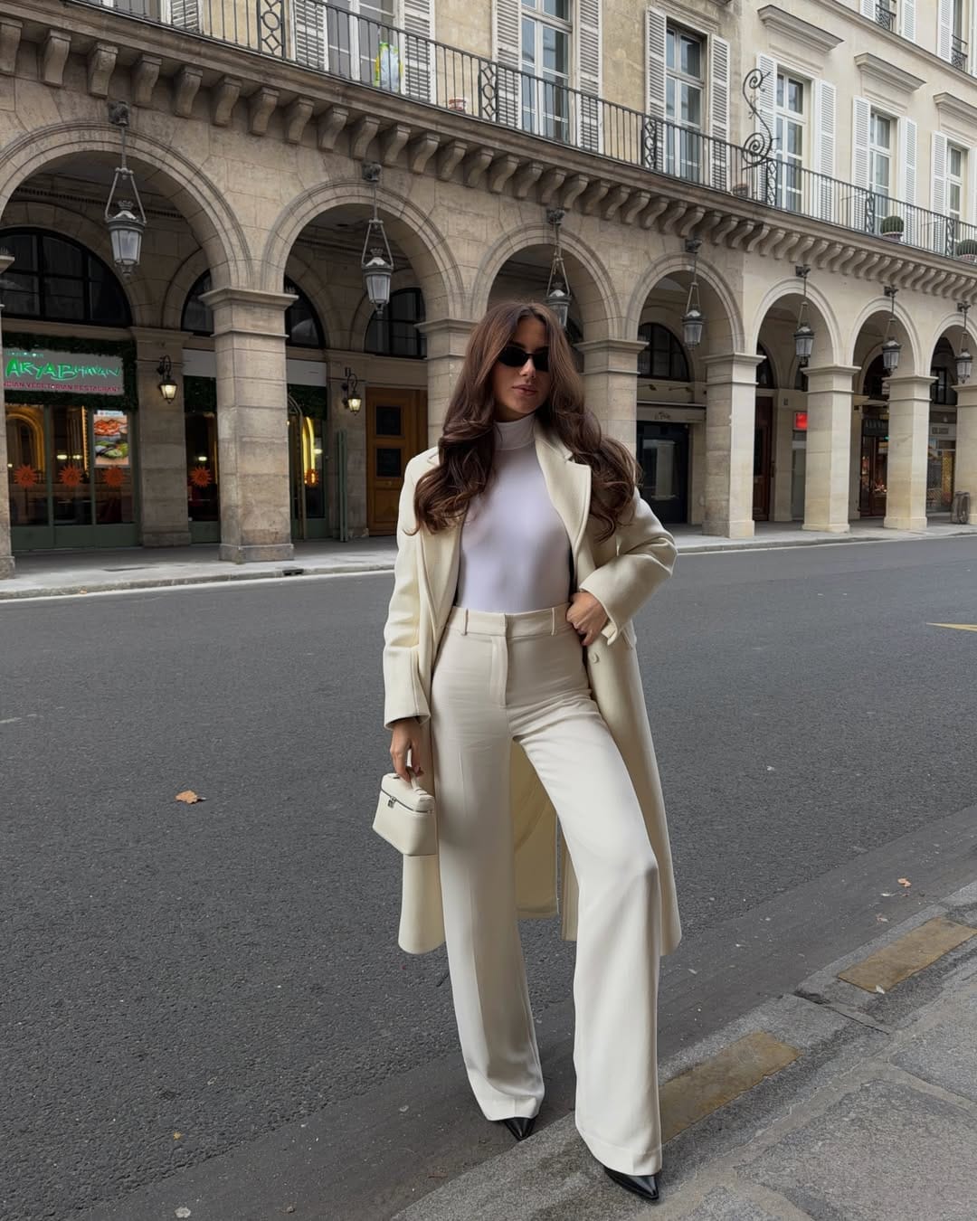 She’s serving full monochrome magic in an ivory long coat over a fitted white turtleneck, styled with matching high‑waisted wide‑leg trousers. Pointed black shoes and a petite white top‑handle bag finish this ultra‑chic city‑stroll look.
