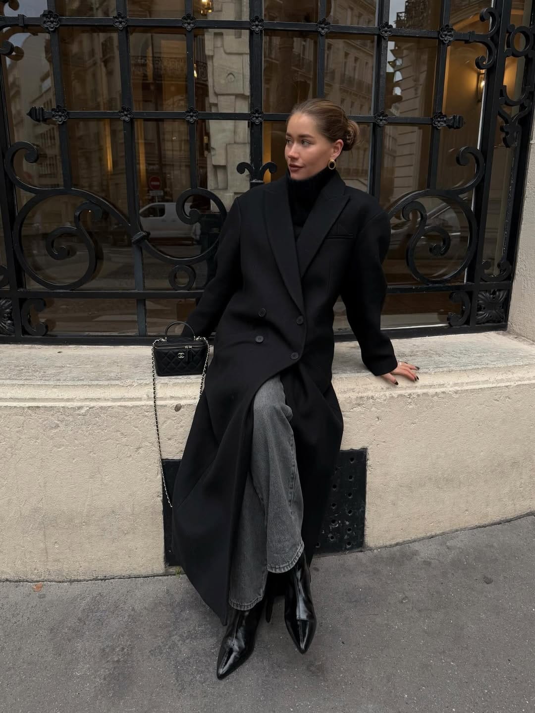 She’s serving quiet‑luxury city vibes in a long black tailored coat over a black turtleneck, paired with straight faded‑grey jeans. Shiny black pointed boots and a small chain‑strap bag keep the outfit minimal, sharp, and perfect for wandering around town.