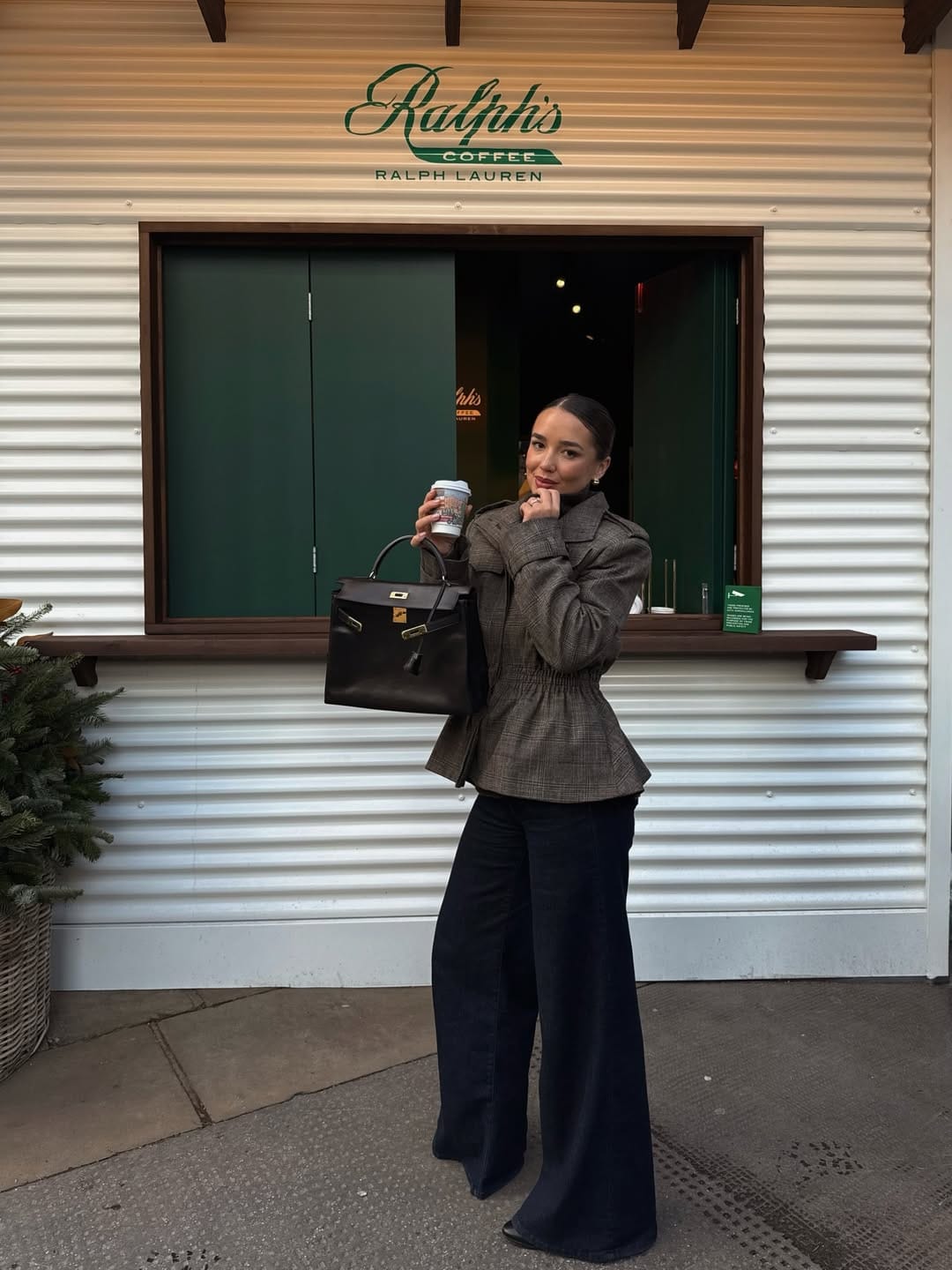 She’s going classic coffee‑run chic in a structured check jacket with a cinched waist, styled over dark wide‑leg trousers. A top‑handle black bag and simple heeled boots pull everything together into a polished yet easy everyday look.