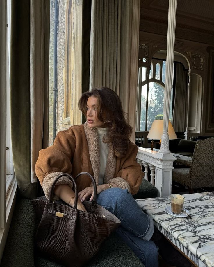 She’s keeping it casual in the best way with a caramel shearling‑lined coat layered over a cream turtleneck sweater and classic blue jeans. A roomy textured tote and simple jewelry finish off this comfy coffee‑date outfit that still feels super put‑together.