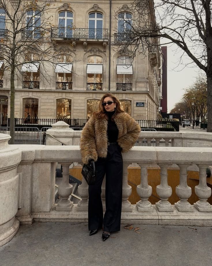 She’s bundled up in a luxe tan faux‑fur jacket over a fitted black top, paired with high‑waisted wide‑leg black trousers for that effortlessly chic city vibe. Pointed black heels and a structured handbag keep the whole look ultra polished and perfect for a day of strolling past designer boutiques.