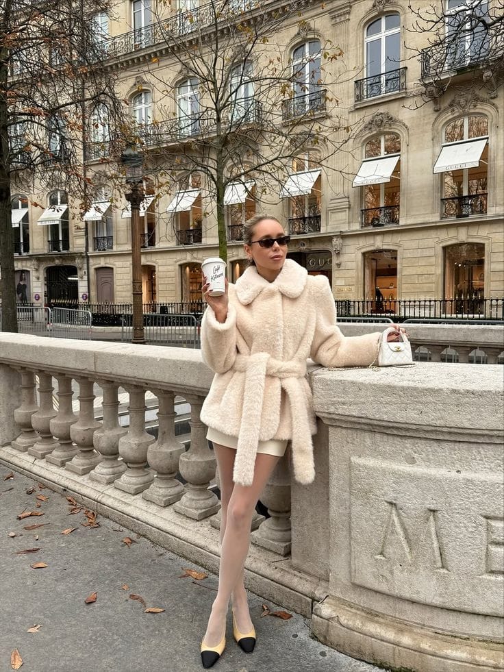 She’s serving soft Parisian glam in a fluffy cream belted coat layered over a matching mini skirt, with sheer tights to keep everything sleek and feminine. Two‑tone cap‑toe heels and a tiny top‑handle bag make this coffee run feel straight out of a chic winter movie.