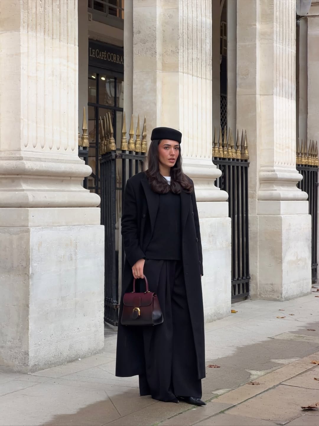 She’s in full Parisian mode with a long black tailored coat layered over a simple black top and flowy wide‑leg trousers, topped off with a structured black hat. A burgundy‑and‑black top‑handle bag and pointed black shoes add just the right amount of drama while still keeping things super sleek.
