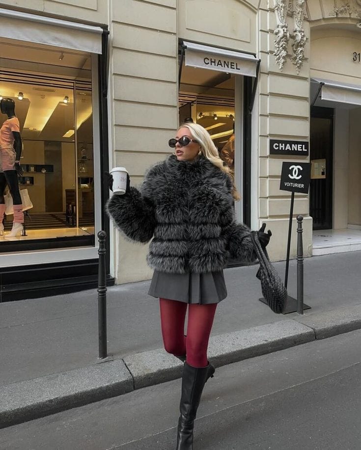 She’s turning the sidewalk into a runway with a fluffy grey faux‑fur jacket over a dark pleated mini skirt and bold red tights for that playful, high‑fashion moment. Tall black boots, gloves, and a textured black shoulder bag keep everything chic while she sips her coffee outside the boutiques.