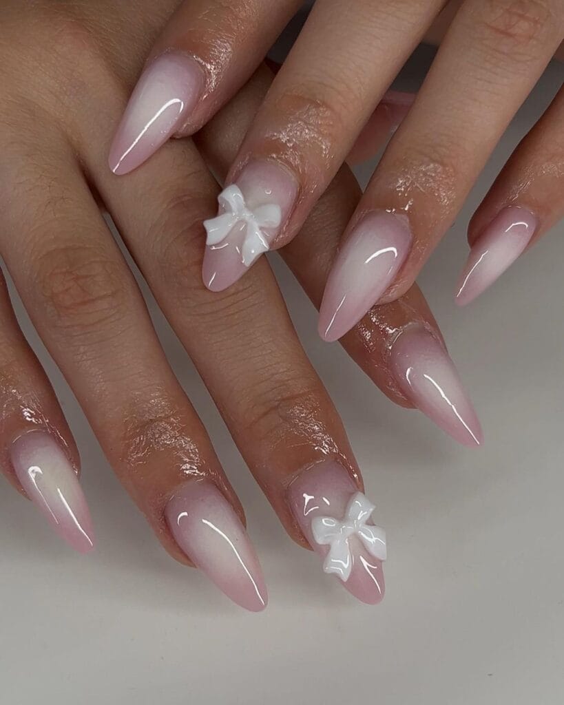 2. Sweet Sophistication: Baby Pink Aura Nails with a Delicate Bow Accent