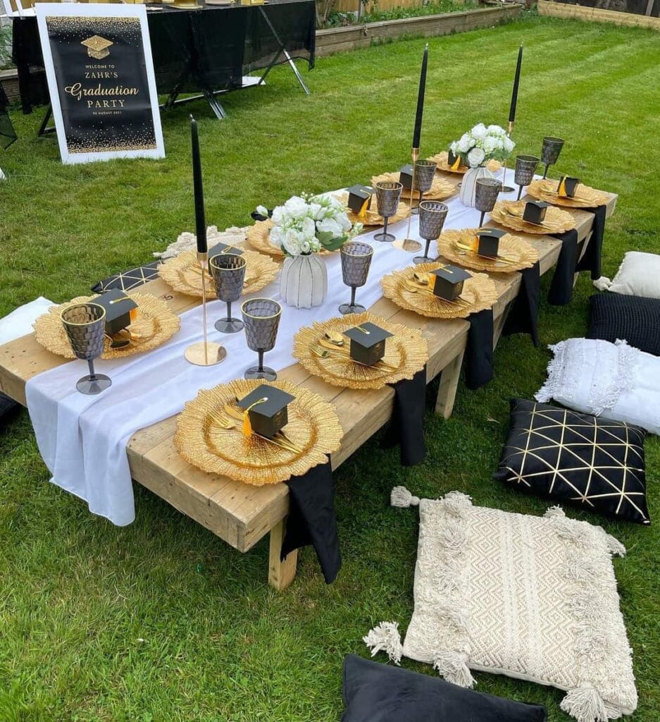Imagine a stylish outdoor setting adorned with black and gold accents, creating a perfect blend of elegance and casual vibes. It’s a picnic with a touch of glam to celebrate your academic success.