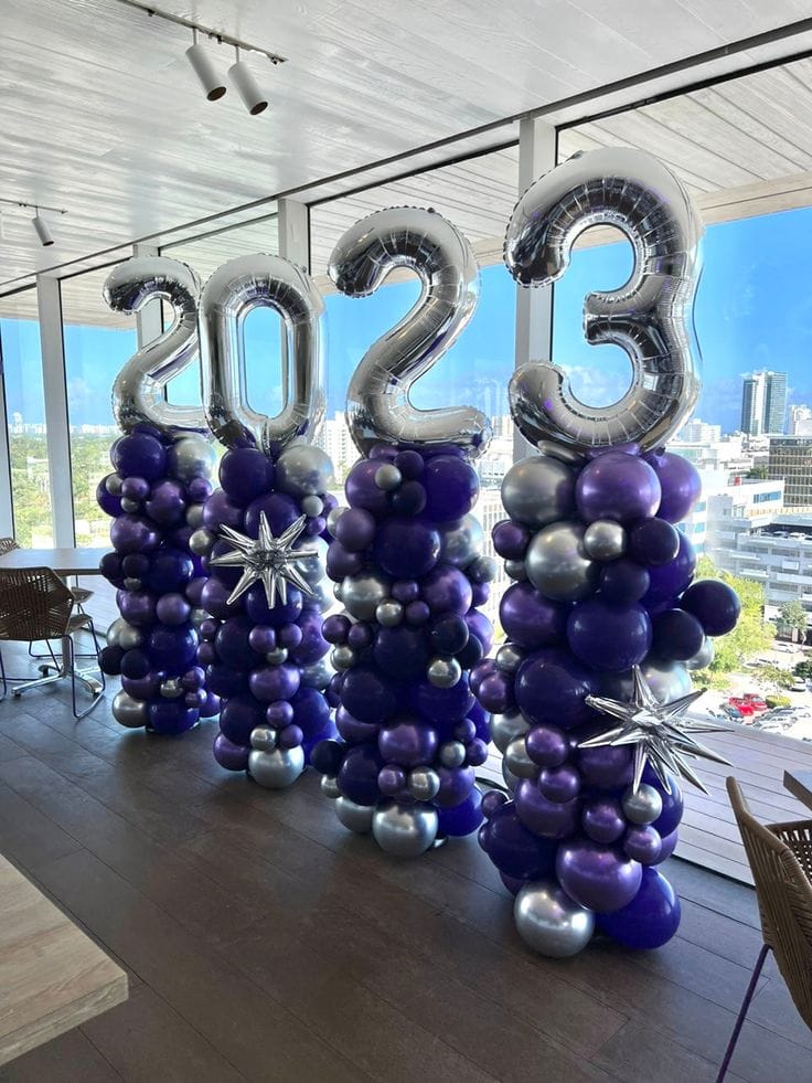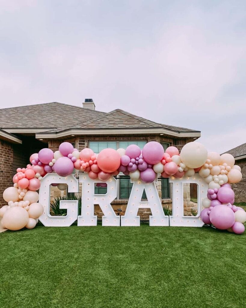 Transform your party space with a Grad Sign surrounded by large, vibrant balloons.