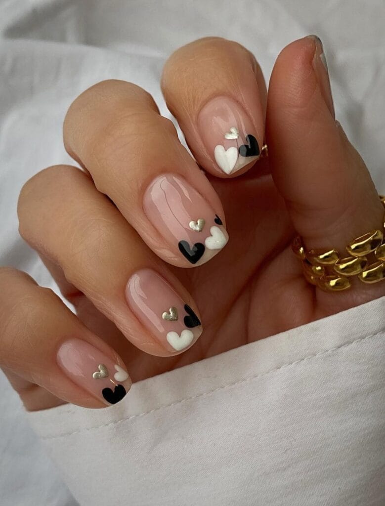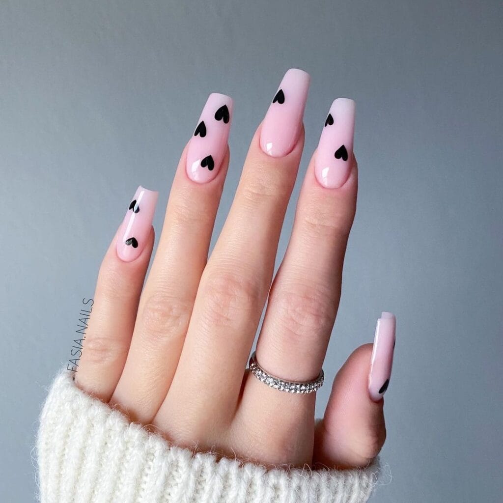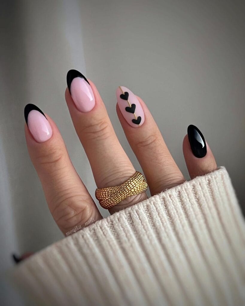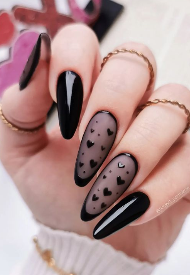 Embrace the unconventional with these sleek black heart-themed nail designs. Contrary to the typical Valentine’s palette, these nails exude sophistication and mystery.