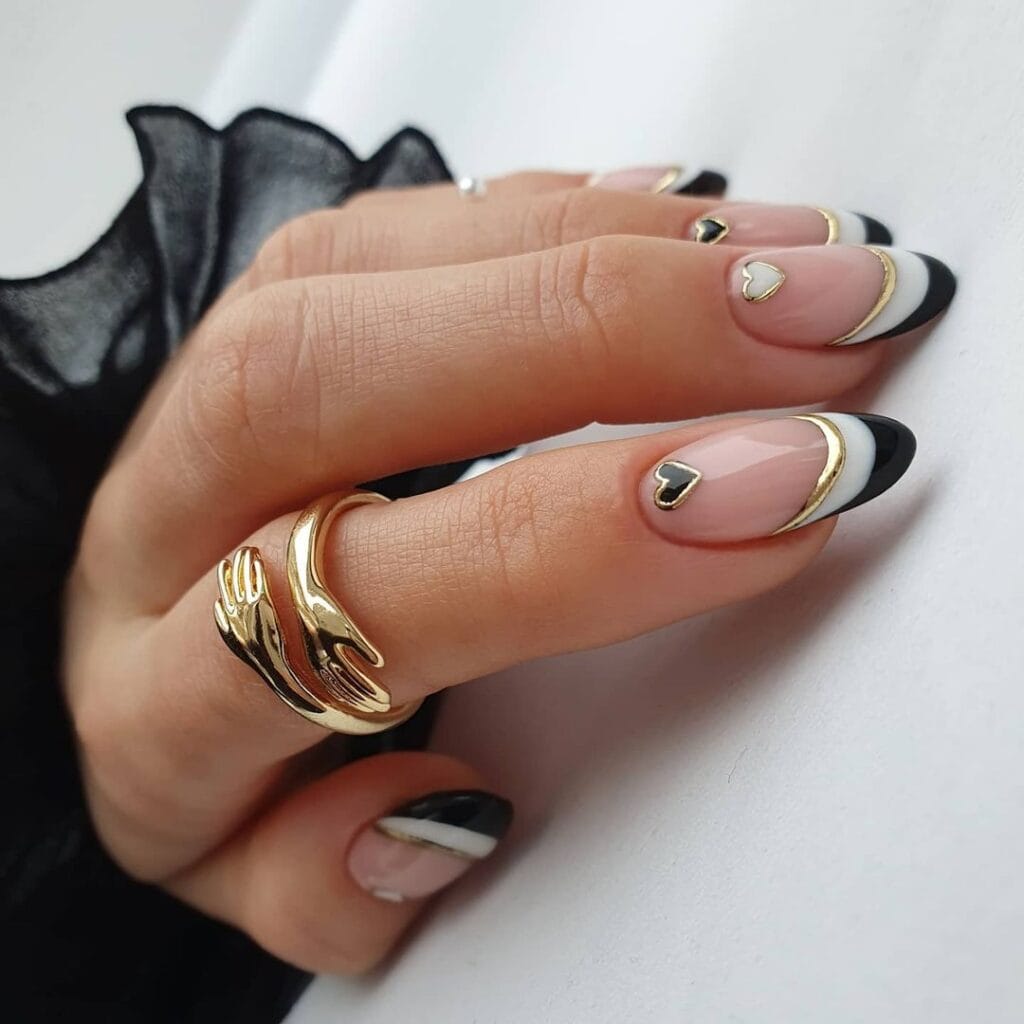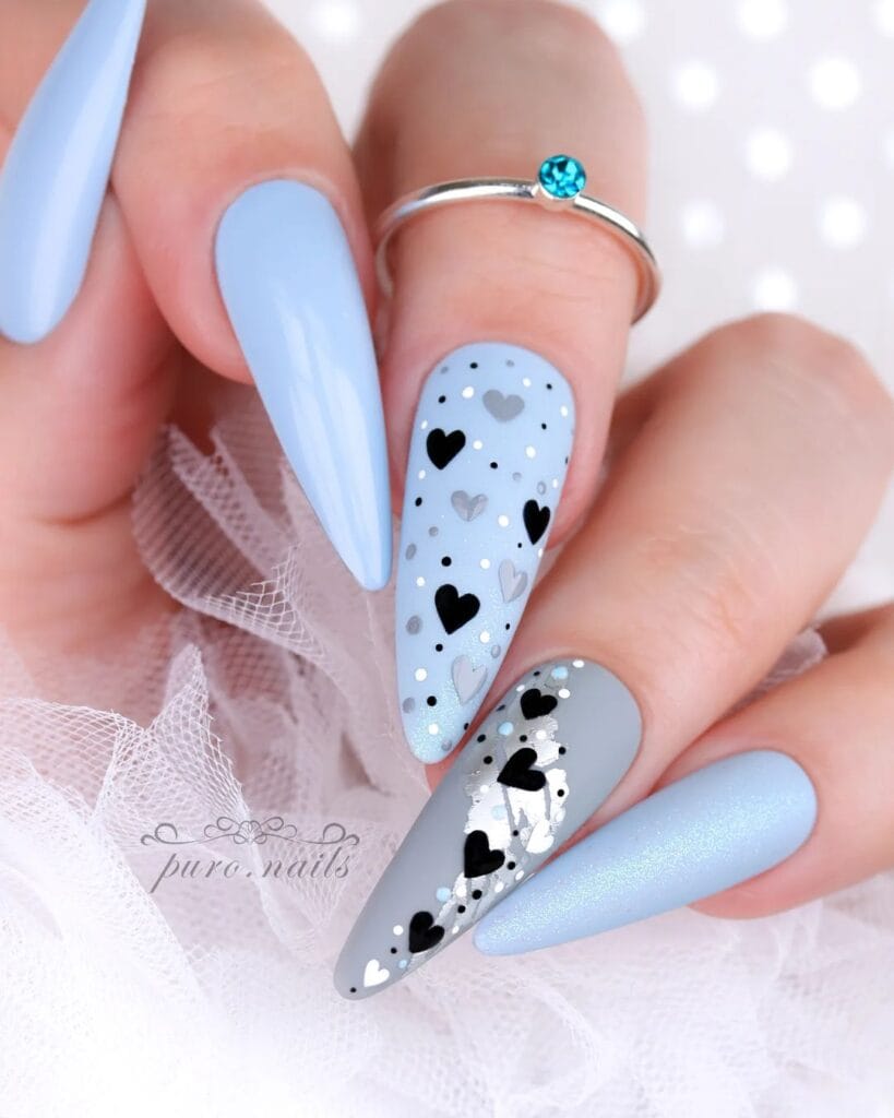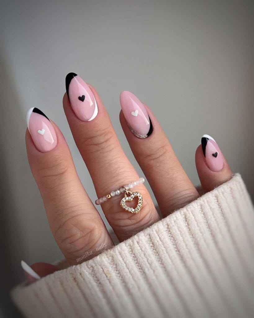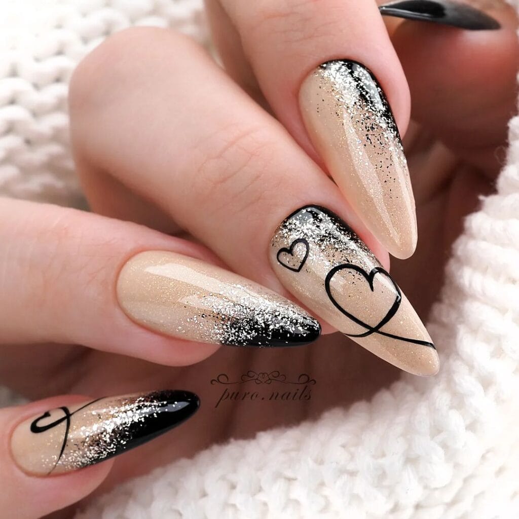 Embrace the unconventional with these sleek black heart-themed nail designs. Contrary to the typical Valentine’s palette, these nails exude sophistication and mystery.