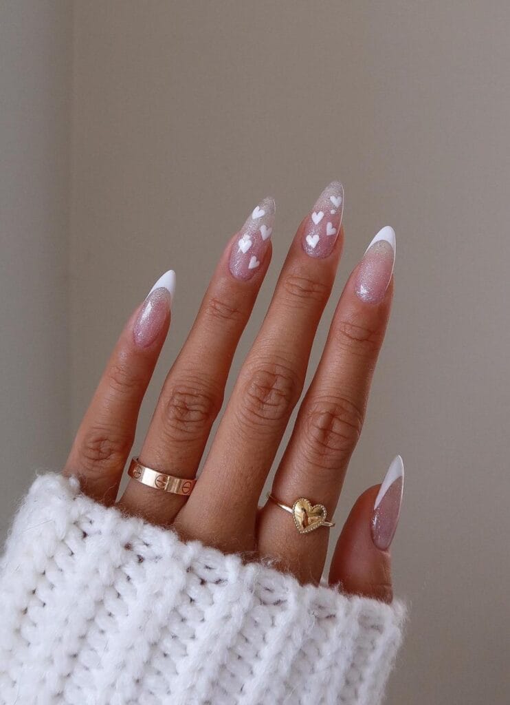 Elevate your Valentine’s Day look with these dazzling sparkling heart nail designs. Infused with glitter, these nails add an enchanting touch, shimmering with every movement.