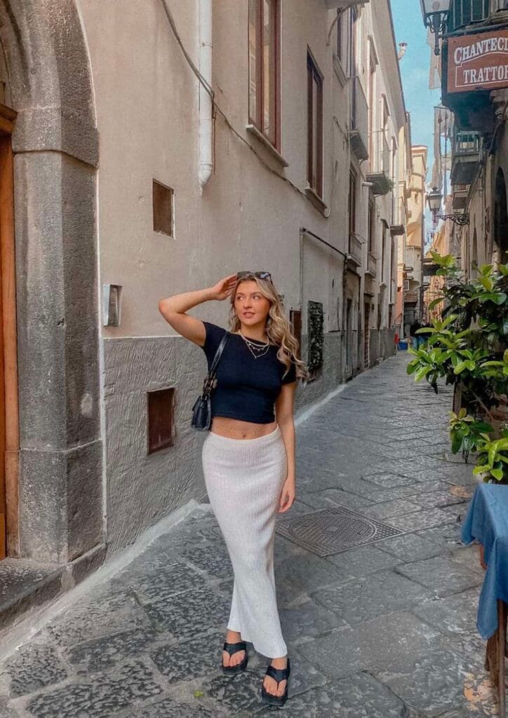 A black cropped top paired with a ribbed white maxi skirt creates a sleek and effortless contrast. Black platform sandals add a modern edge, while layered gold jewelry elevates the ensemble. Finished with a black shoulder bag and sunglasses, this look is perfect for exploring quaint Italian streets in style.