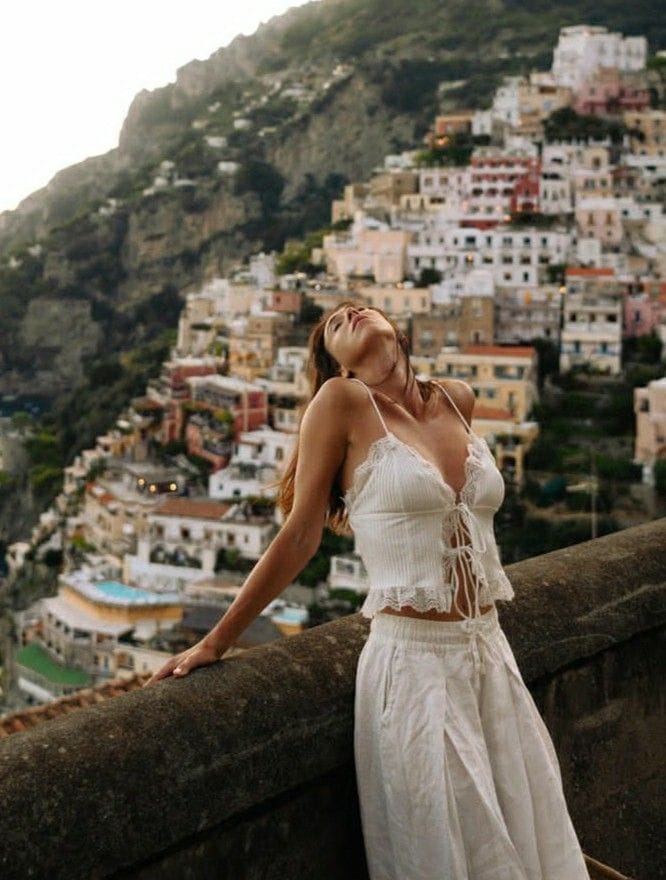 A delicate lace-up cami and flowing white skirt capture the effortless romance of the Amalfi Coast. The breezy fabric and soft, feminine details embrace a carefree summer spirit. Perfect for golden-hour moments overlooking Positano’s breathtaking cliffside views.