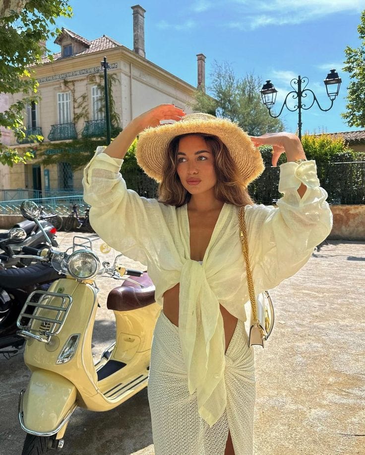 A breezy white tie-front blouse and textured wrap skirt create the perfect sun-kissed summer look. A wide-brim straw hat and gold-chain shoulder bag add effortless elegance. Ideal for a stylish Vespa ride through the charming streets of the Italian countryside.