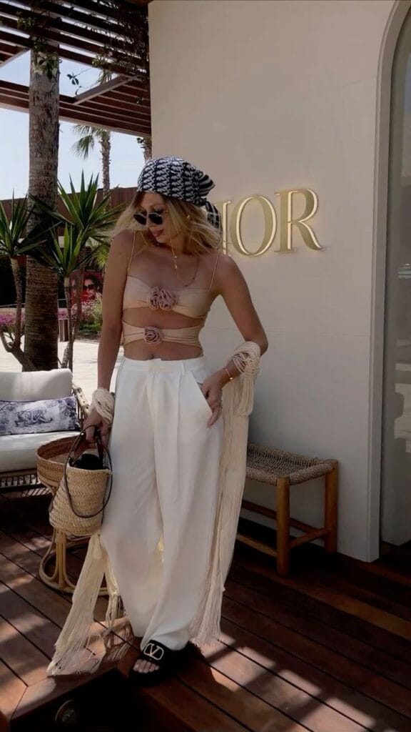 A dreamy white sundress with delicate cutouts and a flowing skirt captures effortless elegance. Barefoot and basking in the Italian sun, this look is perfect for a tranquil escape by Lake Como. The soft, romantic silhouette blends seamlessly with the breathtaking scenery.