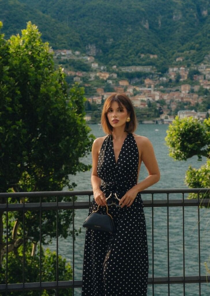 A timeless black polka dot halter dress exudes effortless elegance with its cinched waist and flowing silhouette. Gold statement earrings and a structured black handbag add a refined touch. Perfect for a serene evening by the shores of Lake Como.