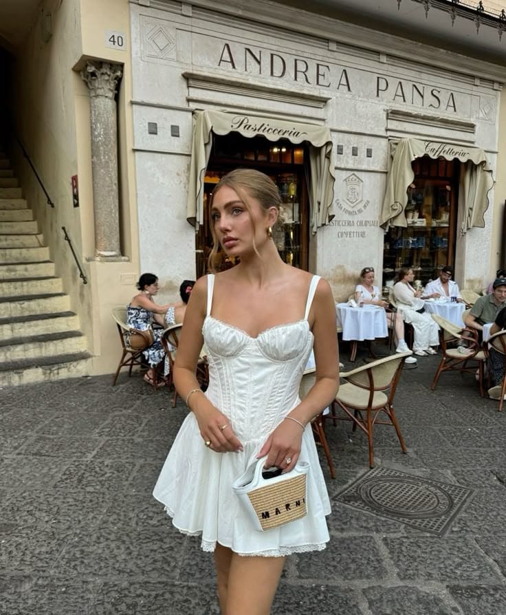 A romantic white corset dress with lace detailing exudes vintage elegance and femininity. Paired with a woven mini bag and delicate gold jewelry, this look is effortlessly charming. Perfect for sipping espresso at a quaint Italian pasticceria.