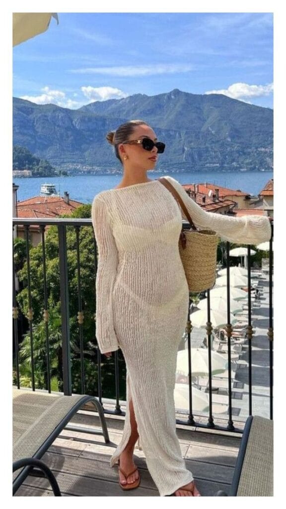 A sheer, textured maxi dress with a high slit exudes understated elegance and effortless allure. Styled with oversized sunglasses, a woven tote, and minimalist sandals, this look is perfect for a chic getaway at Lake Como.