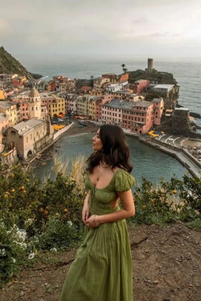 A flowing olive-green dress with puffed sleeves and delicate cutouts blends effortlessly with the rustic Italian landscape. Soft, lightweight fabric drapes beautifully, creating a dreamy, romantic silhouette. Perfect for golden-hour strolls overlooking the picturesque villages of Cinque Terre.