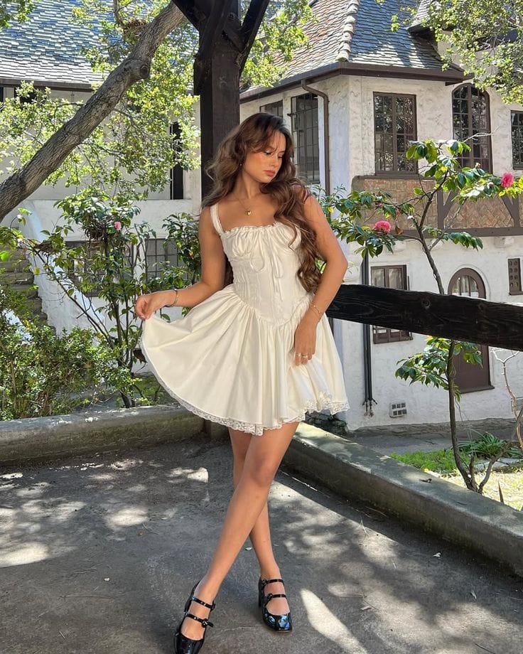 A dreamy white corset dress with delicate lace trim exudes vintage femininity. Paired with glossy black Mary Janes and dainty gold jewelry, this look is effortlessly romantic. Perfect for a whimsical afternoon in an Italian countryside villa.