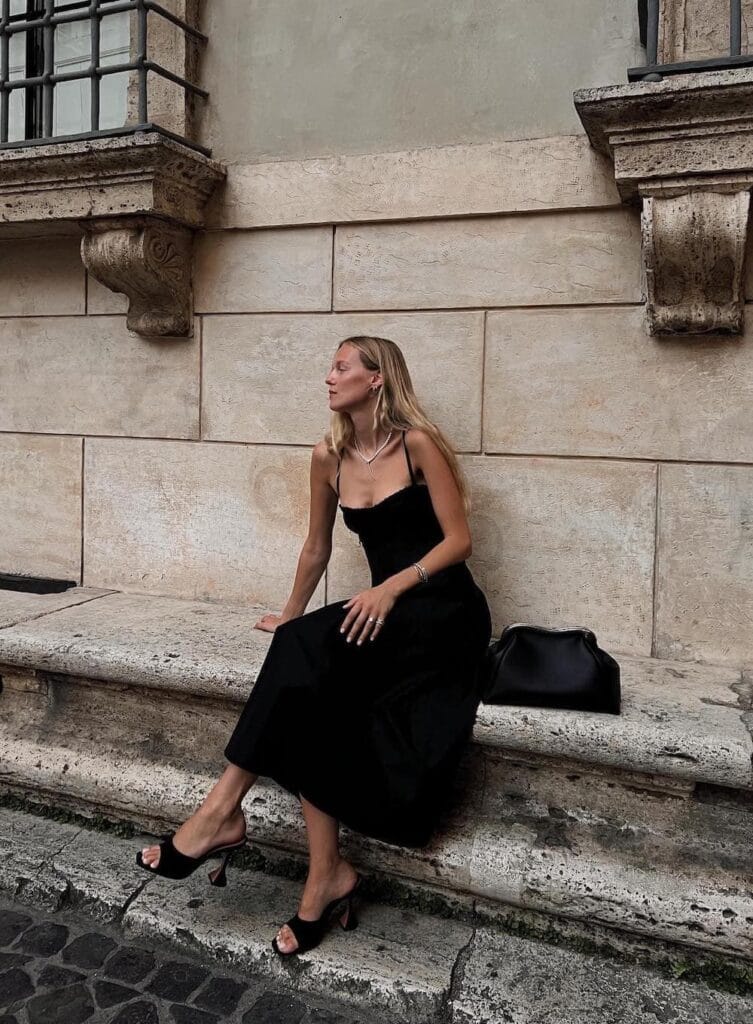 A chic black midi dress with delicate straps exudes timeless sophistication. Paired with sleek heeled mules, silver jewelry, and a structured black handbag, this minimalist look is perfect for a summer evening in Rome.