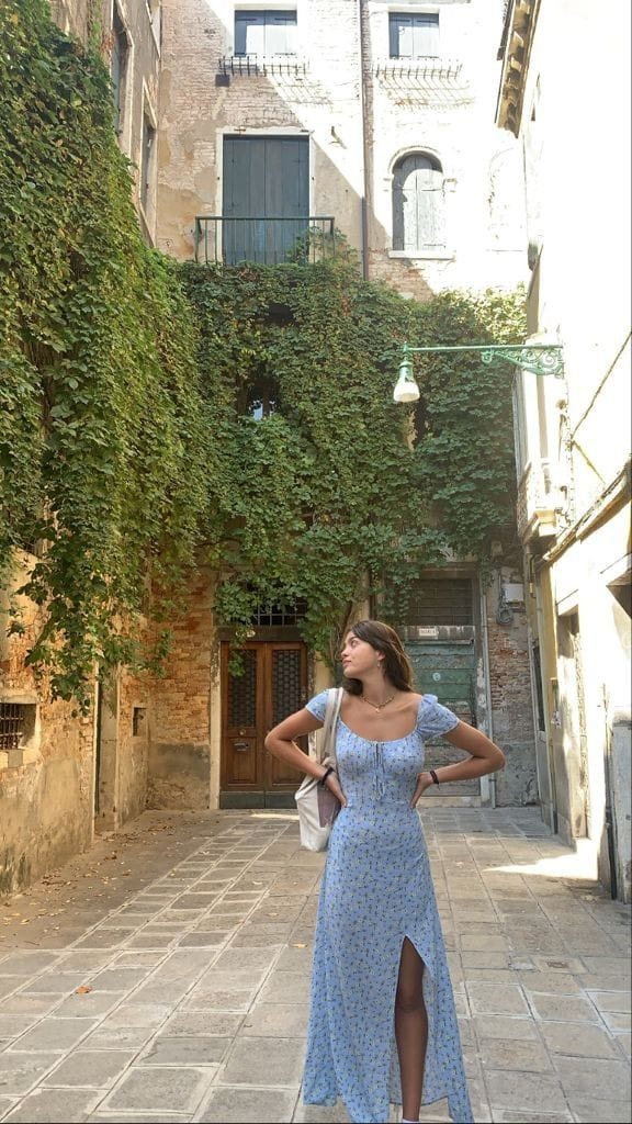 This effortless light blue floral dress with a thigh slit captures the essence of a dreamy Italian summer. Featuring a sweetheart neckline and puff sleeves, it radiates elegance while staying comfortable. Paired with a simple tote bag and minimal accessories, this look is perfect for strolling through charming historic alleys in Venice.