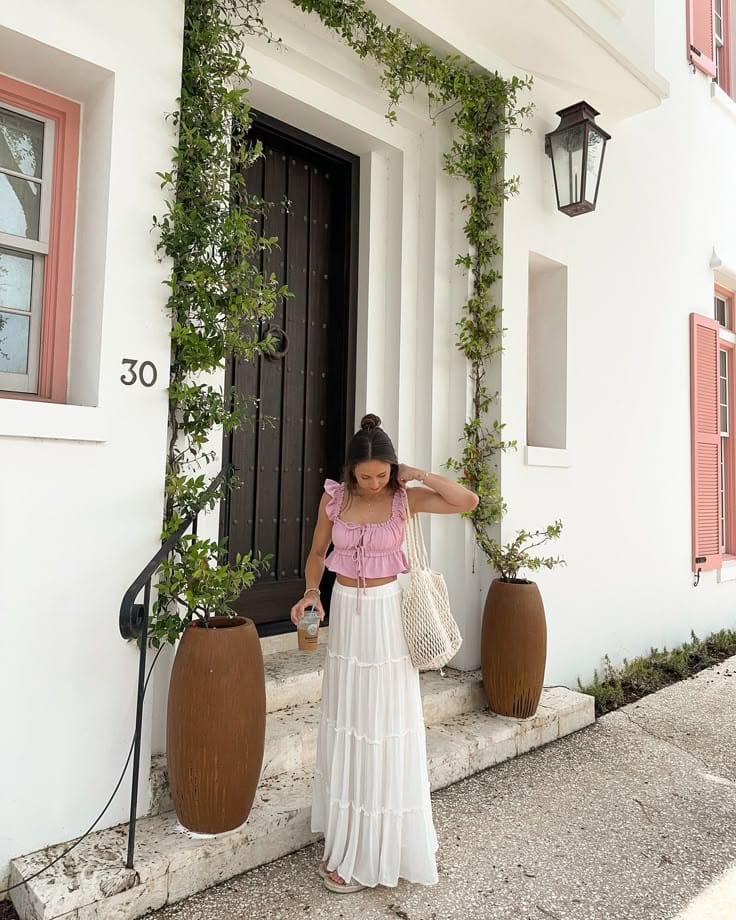 This romantic and airy outfit perfectly captures the essence of a summer in Italy. A soft pink ruffled crop top paired with a flowing white maxi skirt creates a relaxed yet feminine aesthetic, ideal for exploring charming coastal towns or sipping coffee at a quiet café. The woven tote bag and delicate sandals complete the effortless vacation vibe.