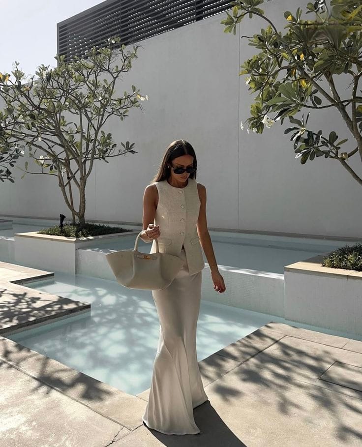 This all-white monochrome ensemble exudes quiet luxury and effortless elegance. The structured sleeveless vest paired with a flared maxi skirt creates a sophisticated silhouette, perfect for a summer day in a modern, serene setting. Accessorized with a matching oversized tote bag and sleek sunglasses, this look embodies understated sophistication, making it ideal for a resort getaway or an upscale urban stroll.