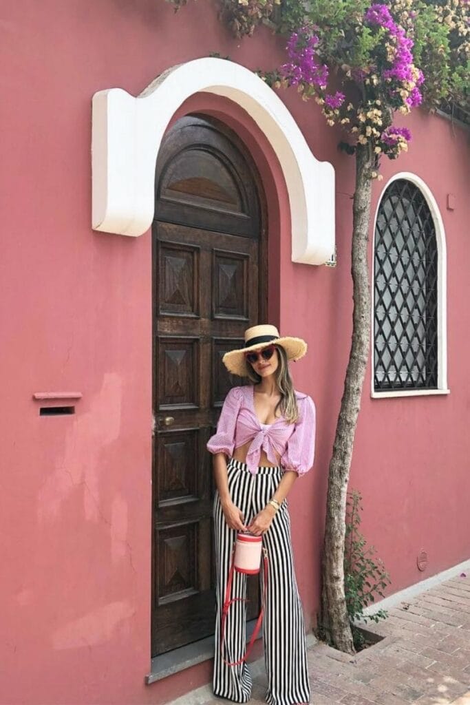 A knotted gingham blouse paired with bold striped wide-leg trousers creates a striking yet playful contrast. A straw sun hat and cat-eye sunglasses add vintage charm, while a red-accented bucket bag completes the vibrant summer look. Perfect for wandering through colorful Italian streets in effortless style.