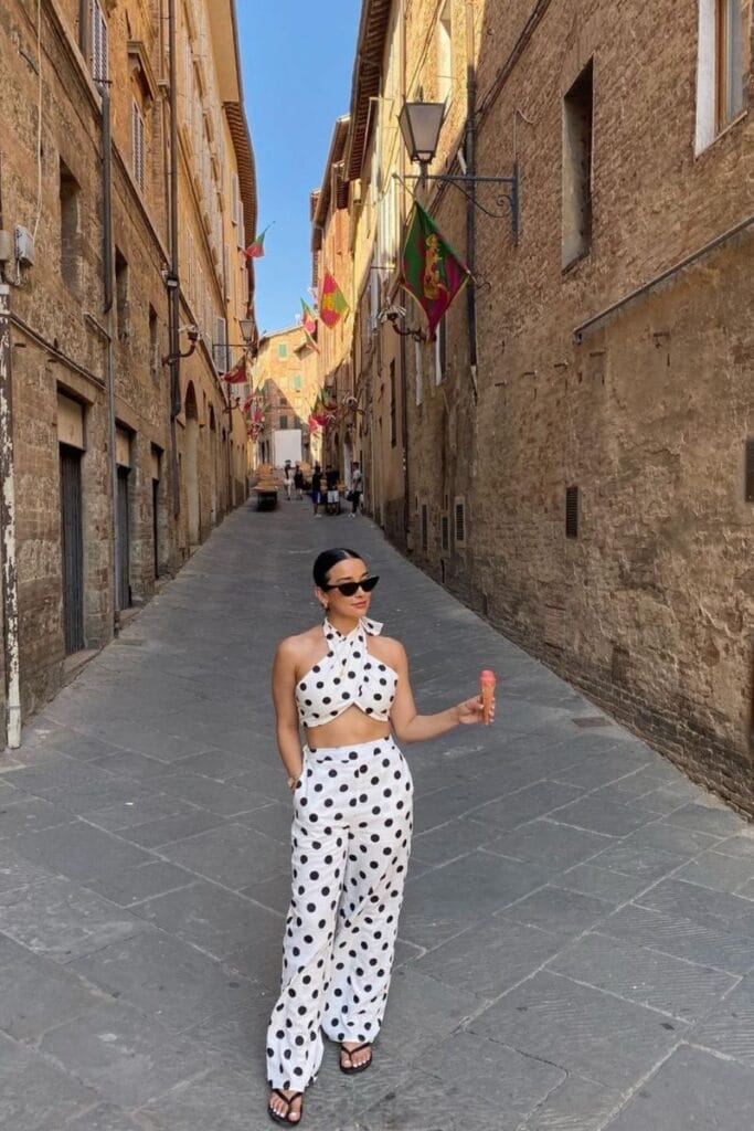 A chic polka dot co-ord set featuring a halter crop top and wide-leg trousers exudes vintage charm. Black cat-eye sunglasses and sleek sandals add a modern edge, while bold red lips complete the look. Perfect for savoring gelato while strolling through sun-soaked Italian streets.