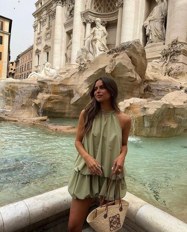 A flowing sage green halter dress exudes soft sophistication with its breezy silhouette. The ruffled hem adds a playful touch, while a woven tote bag enhances the effortless summer aesthetic. Perfect for a dreamy day exploring Rome’s timeless beauty.