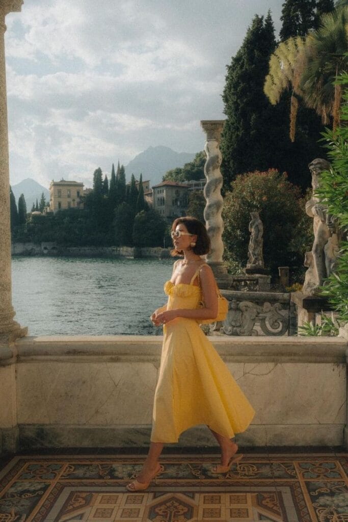 A flowing yellow midi dress captures the warmth and romance of an Italian summer. Paired with delicate heels, a matching quilted bag, and vintage-inspired sunglasses, this look radiates timeless elegance. Perfect for a sunset stroll along the shores of Lake Como.