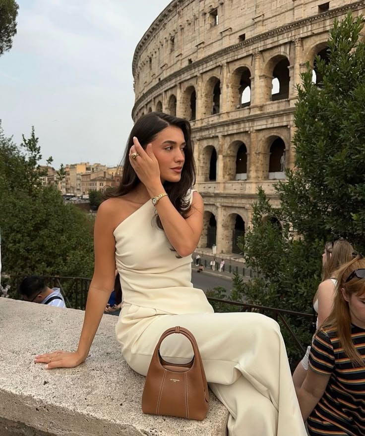 An ivory one-shoulder jumpsuit radiates timeless sophistication with its sleek and refined silhouette. Gold accessories and a structured brown leather handbag add a touch of effortless luxury. Perfect for embracing la dolce vita while admiring Rome’s historic beauty.