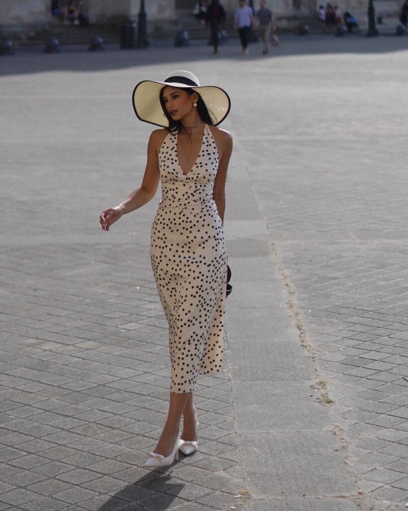This polka dot midi dress with a halter neckline and cinched waist exudes effortless charm. Paired with white kitten heels, it enhances a graceful silhouette. A wide-brimmed sun hat adds a touch of classic Italian sophistication. Perfect for a sunlit stroll through charming cobblestone streets.
