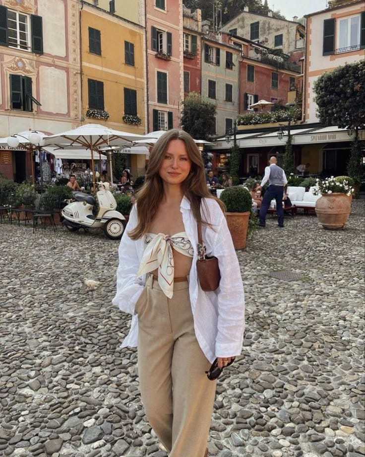 A silk scarf worn as a bandeau top adds a chic, vintage touch to this neutral-toned ensemble. High-waisted beige trousers and a breezy white linen shirt create a relaxed yet polished look. Finished with a brown leather shoulder bag and sunglasses, this outfit is perfect for café-hopping in a charming Italian piazza.