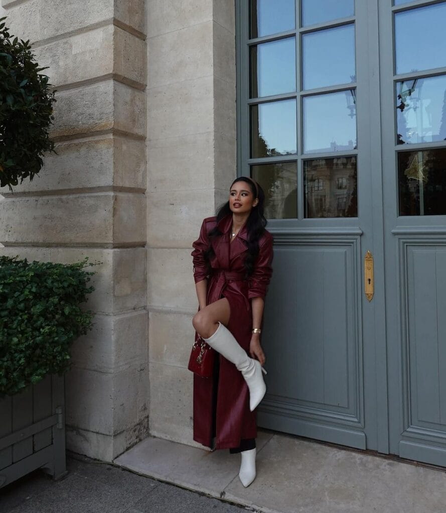 9. Fierce Contrast: Red Leather Trench Coat and White Knee-High Boots