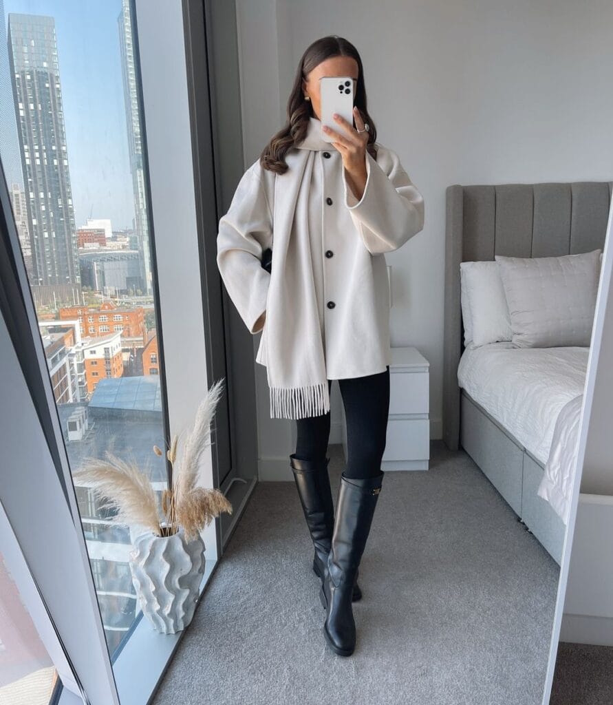 14. Cozy and Casual: White Cardigan, Scarf, and Black Leggings with Boots